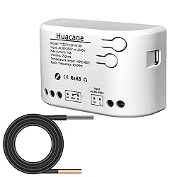 - Power supply:USB 5V/AC 85-250V Wireless Standard: Zigbee Operating Temp: -40~80 °C Material: RF-ABS Size:2.8 x 1.8 x 1.1 inches Connector: Universal screw connection Include waterproof temperature sensor,probe:stainless steel temperature probe measuring range:-40~80°C,opeating voltage:3.0-5.5V,length 1m Functions: Remote ON/OFF: Turn electrical devices on/off from anywhere,when the temperature of enviroment fall within the rang,it will automatically turn on/off appliance ans support presetting range of temperature,you can also monitor daily power consumption in real time by tuya smart life app Voice Control: Works perfectly with Amazon Alexa Extra RF function,support fixed code 433Mhz RF Tips: Huacaoe Smart zigbee thermostat switch,when pairing,please put the switch close to your hub,please do not exceed the maximum load current of 10A Package Included 1pcs16A Zigbee Wireless smart switch*1pcs 1m waterproof temperature probe sesnor cable 1*Instruction