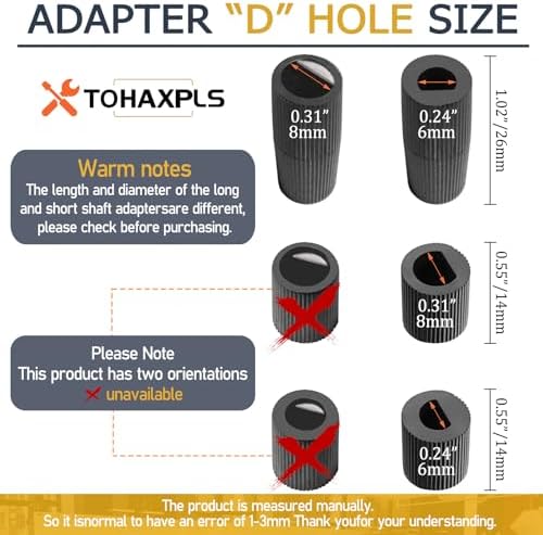 - 【Adapter D-hole Size】(1) The long adapter measures approx: D-hole calibre 8 mm/ 0.31 inch and the height is 26 mm/ 1.02 inch; (2) The short adapter measures approx: D-hole calibre 6 mm/ 0.24 inch and the height is 14 mm/ 0.55 inch