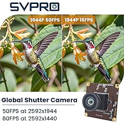 - SVPRO 5MP 50fps Global Shutter USB Camera Module for Computer, Laptop, Raspberry Pi, Jetson Nano,UVC USB2.0 Video Camera Board with 3.3fps/1m Cable for Windows, Linux, Android and Mac OS Camera Specification: Sensor 1/2.5” OmniVision OX05B1S (Global Shutter) Max Resolution (Default) 2592 (H) *1944 (V) Sensor Size 1/2.5 inch (4:3) Image Array Area 5737μm x 4312μm Pixel Size 2.2μm x 2.2μm Central Definition 1000LW/PH (Center) S/N Ratio 38dB Dynamic Range 72dB Sensitivity 1.4V/lux-sec@550nm Min Illumination 0.1 Lux Adjustable Parameters Brightness, Contrast, Saturation, Hue, Sharpness, Gamma, White balance, Backlight Compensation, Exposure Operating System Request WinXP/Vista/Win7/Win8/Win9/Win10/Win11 etc. Linux with UVC (above linux-2.6.26) MAC-OS X 10.4.8 or later, Android Resolution & frame (MJPEG): 2592x1944 @ 50fps MJPEG/ 2592x1440 @ 60fps MJPEG 2560x1440 @ 60fps MJPEG/ 2304x1296 @ 60fps MJPEG 2048x1536 @ 50fps MJPEG/ 1920x1080 @ 60fps MJPEG 1600x1200 @ 50fps MJPEG/ 1600x900 @ 60fps MJPEG 1280x960 @ 50fps MJPEG/ 1280x720 @ 60fps MJPEG 1024x768 @ 50fps MJPEG/ 1024x576 @ 60fps MJPEG 960x720 @ 50fps MJPEG/ 960x540 @ 60fps MJPEG 800x600@ 50fps MJPEG/ 800x450 @ 60fps MJPEG 848x480 @ 60fps MJPEG/ 640x480 @ 50fps MJPEG 640x360 @ 60fps MJPEG/ Lens Parameters: Focus Fixed Focus M12 No Distortion Lens Field of View: 120 degree Power: Interface USB2.0 High Speed Operating Voltage DC 5V Working Current 180mA- 230mA AEC/AWB/AGC Support Working Temperature 0°C to 60°C Storage Temperature -20°C to 80°C Dimensions: Dimension 38mm x 38mm USB Cable 1M