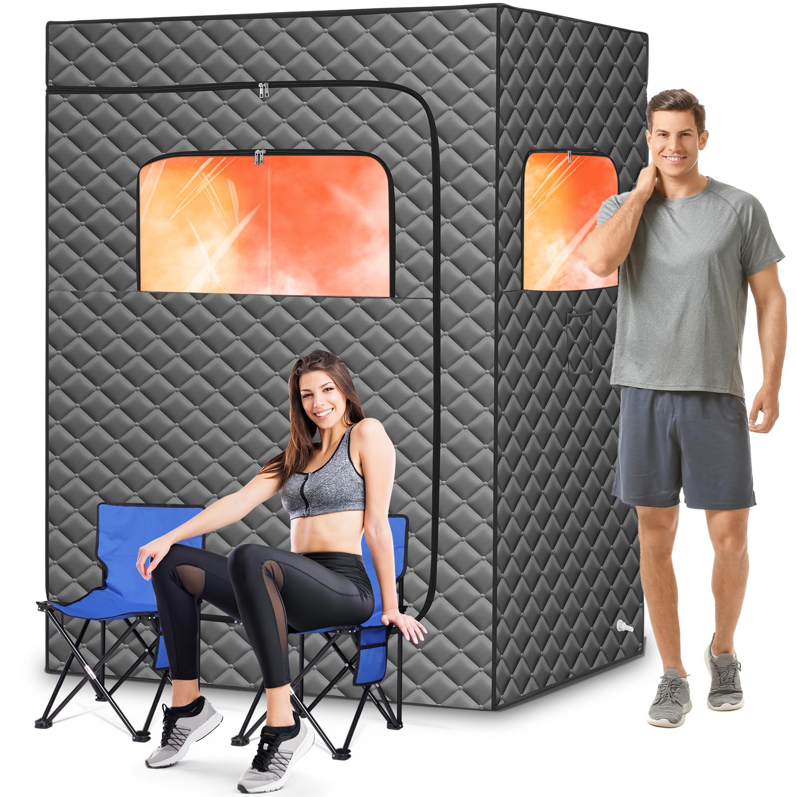 - 【Extra Large Size 71”x 49”x 36”】This double sauna box allows two people to sauna at the same time. You can sauna with your family or friends. You can stand or sit inside, and 2 folding chairs allow you to enjoy the sauna more comfortably.