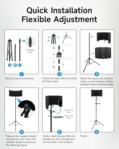 - 【Foldable & Adjustable】Only take minutes to unfold this recording studio equipment, The 5 folding microphone shield panels are adjustable at 180°adjust the angle,and the included screw adapter makes it easy for you to adjust the tightness. The studio mic stand can be fixed on a desk or tabletop, and also can be mounted to a microphone stand.