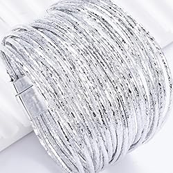 - Elevate your style with our FANCY SHINY Boho Leather Bangle Bracelets, a stackable, layered jewelry piece that combines modern elegance with a vintage touch. Crafted from 26 thin, chic faux leather cords, this 7.7" x 1.2" bracelet features a secure magnetic clasp for easy wear. The silver-plated, round design is perfect for any occasion, making it a versatile addition to your jewelry collection.
