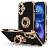 Hython for iPhone 16 Case with Ring Stand, 360° Rotatable Ring Holder Magnetic Kickstand, Plating Rose Gold Edge Soft Cover Protective Phone Case for iPhone 16 6.1", Black