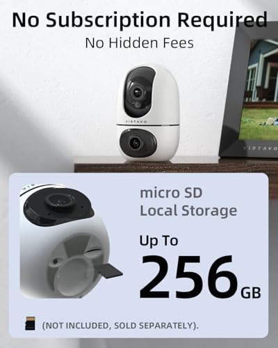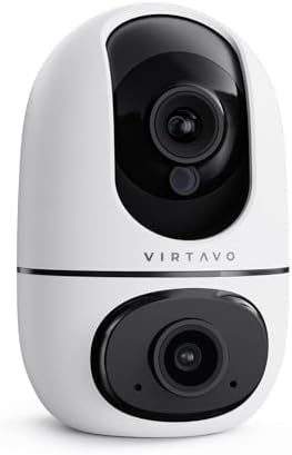 virtavo XD1 Indoor Security WiFi Camera, No Subscription Required, Dual-Lens 360° PTZ Baby Monitor & Pet Cam, Motion Tracking, 2-Way Audio, Night Vision, Cloud/SD Storage, Phone App, Plug-in Power