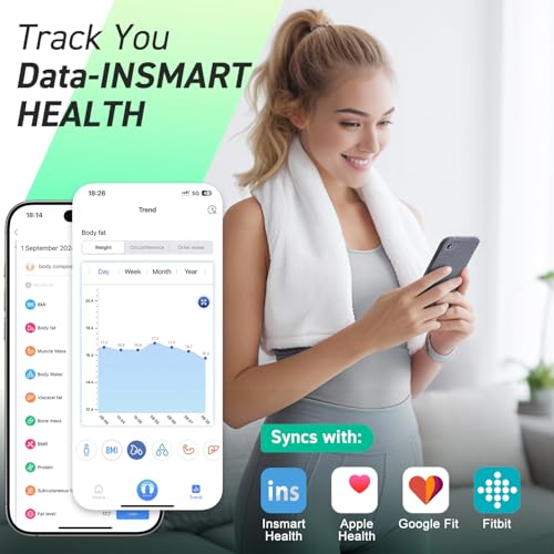 - 【BODY COMPOSITION ANALYZER】INSMART smart weight scale can measure your 17 essential body composition metrics,your Weight, BMI, Body Fat, Fat-free Body Weight, Subcutaneous Fat, Visceral Fat, Body Water, Skeletal Muscle, Muscle Mass, Bone Mass, Protein, BMR, Standard weight, body type, obesity level and Metabolic Age with high accuracy.You can check your data from the free scales app, and monitor your health anytime which can help guide you towards a healthier lifestyle or track your fitness progress