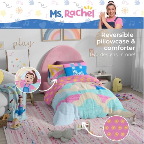 • TWO DESIGNS IN ONE COMFORTER: This bedding set comes with a reversible comforter offering two fun looks. One side displays Ms. Rachel with a sun and rainbow motif, while the reverse side features a pink pattern with sunny daisies, giving your little one the option to switch up their room decor easily.
