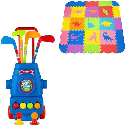 SAFE AND NON-TOXIC MATERIAL: Our dinosaur foam mat is composed of EVA non-toxic foam, ensuring safety and durability. It's perfect for your child's delicate skin, especially during their crawling phase. With 12”x12” tiles, this baby floor mat foam offers ample space for play. Complete Beginner Golf Set! – Our ToyVelt Mini Golf Set includes a practical golf cart with 2 wheels, 4 colorful golf clubs of different shapes and sizes, 6 special balls, a putting mat, and 2 practice holes. Perfect for little golfers