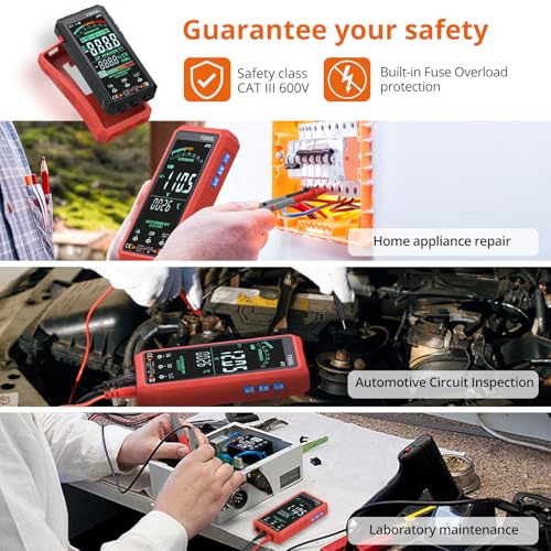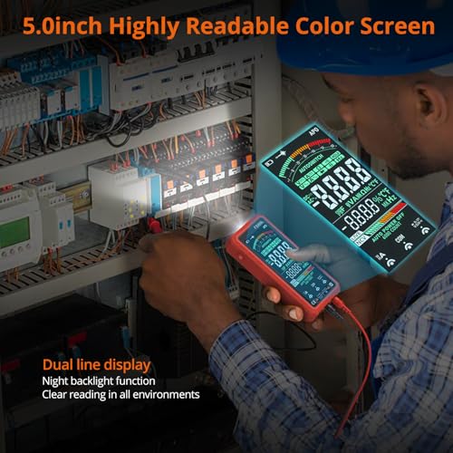 - 【5.0 Inch Colour Screen Smart Multimeter】The 5.0 Inch Colour Screen with Backlight and Built-In Flashlight Lets You Read Data Clearly in Dark Garages, Under Car Hoods, or During Home Electrical Repairs