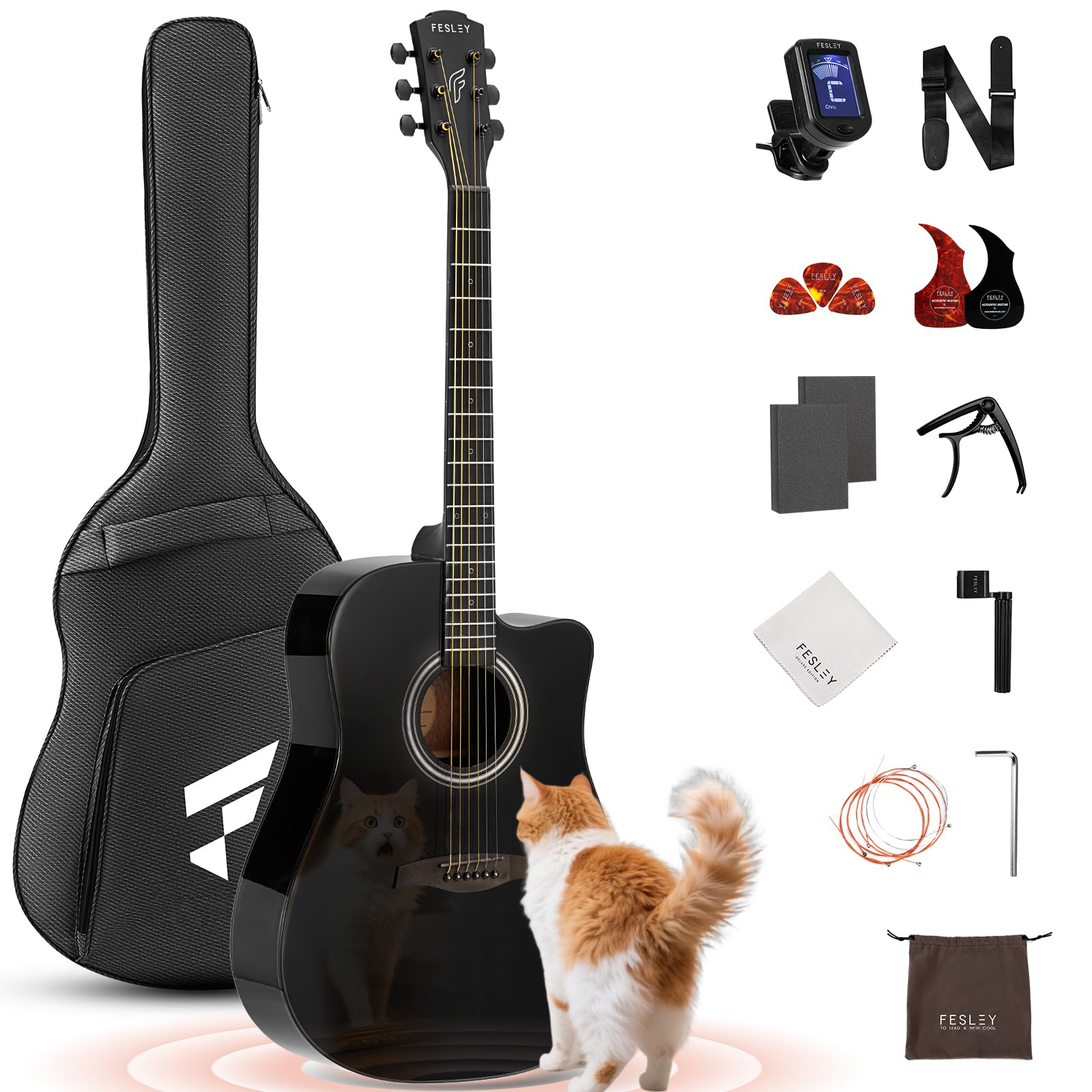 41" Acoustic Guitar Kit for Beginner: 4/4 Full Size Cutaway Acustica Guitarra Bundle for Adult Teen with Gig Bag, Tuner, Strap, Strings, Picks, Capo, FF60, Black