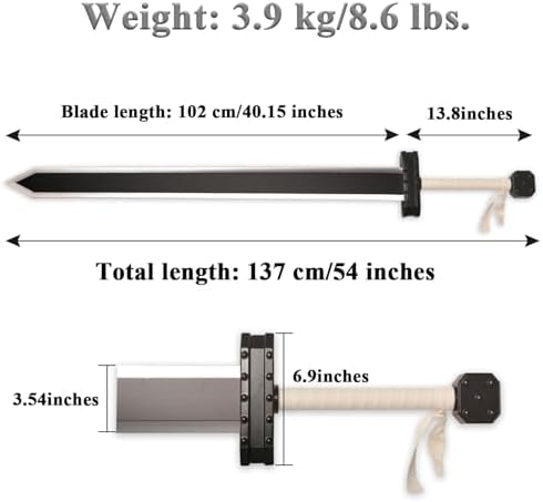 - Dimensions-Weight (with leather sheath) 3.9 kg/8.6 lbs. Overall length 137 centimeters/54 inches. Blade length 102cm/40.15 inches. Blade length 3.54 inches. Handle length 13.8 inches.