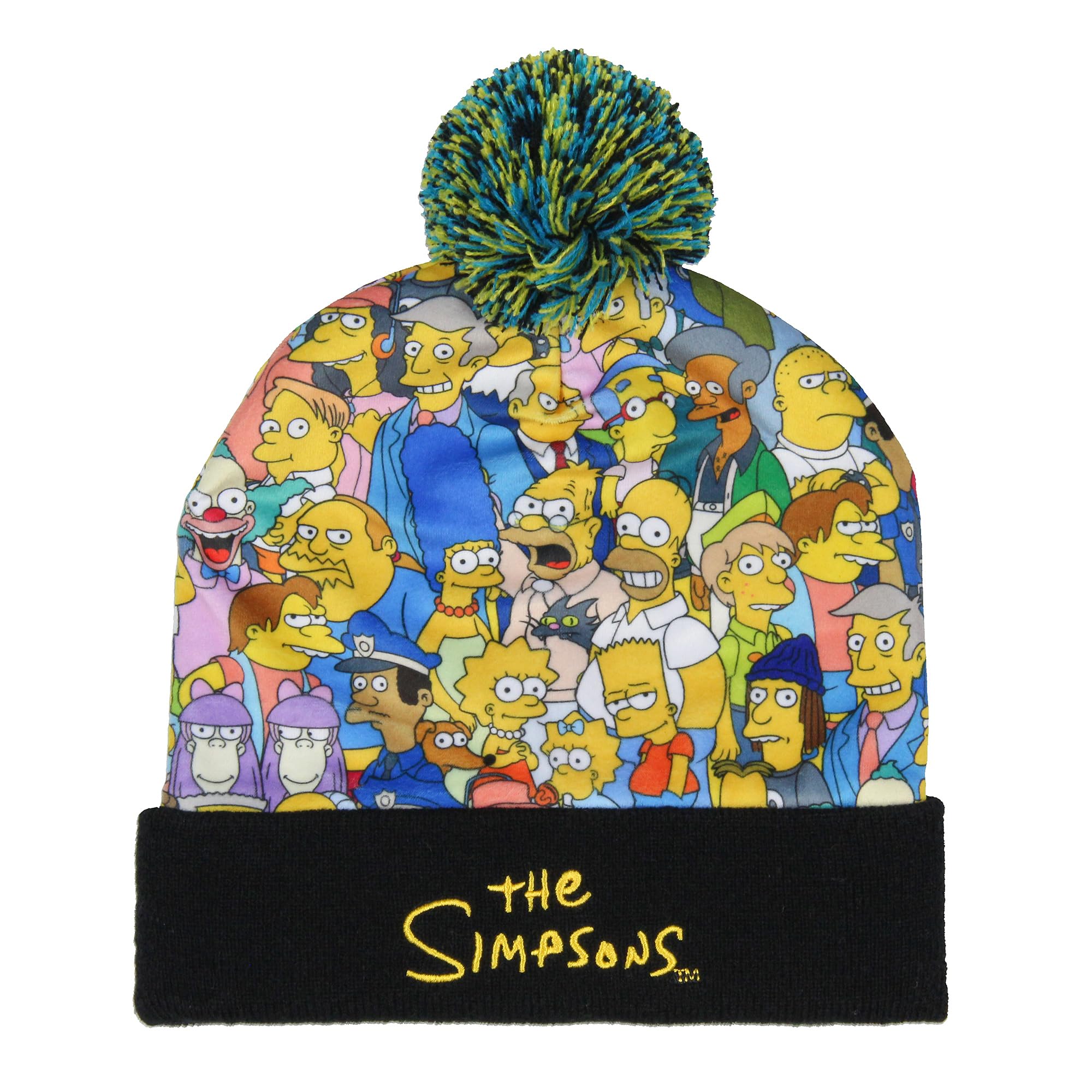 The Simpsons Character Collage Embroidered Logo Fold Cuff Pom Top Adult Knit Beanie Multicolored