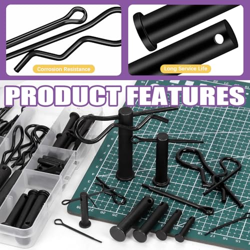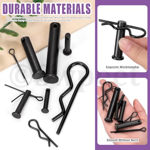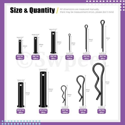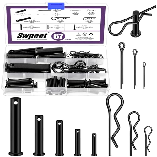 Swpeet 67Pcs 5 Sizes Clevis Pins with Cotter Pin Assortment Kit, Single Hole Flat Head Clevis Pins, R Pins, Hairpin, Cotter Pin, Split Pins Fitting Hole Location Pin Clips Fastener 👑 Why Choose Us? 🏅 1.Various Options ✨ 5 Sizes Clevis Pins for you to choose from, including M5×25, M6×30, M8×40, M10×45, M12×65. 🏅 2.High Quality ✨ All the pins are made of high-quality carbon steel, with strong hardness, rust and corrosion resistant, durable and steady not easy to break. Smooth surface, no burrs, will not hurt your hands when used. 🏅 3.A Complete Kit ✨ Our pin fasteners kit includes 3 different styles. Hairpin Cotter and R Cotter are given,which give fast and secure hold for Clevis Pins to ensure stability 👑 Specifications ✨ Material: Carbon Steel ✨ Size: As shown in the picture ✨ Color: Black 👑 Package Includes: 💫(1)Clevis Pins ✨ 10Pcs -------- M5×25 ✨ 10Pcs -------- M6×30 ✨ 5Pcs -------- M8×50 ✨ 5Pcs -------- M10×45 ✨ 3Pcs -------- M12×65 💫(2)R Pin ✨ 10Pcs -------- M2×40 ✨ 5Pcs -------- M3×60 ✨ 2Pcs -------- M4×80 💫(3)Cotter Pins ✨ 10Pcs -------- M2×40 ✨ 5Pcs -------- M3×45 ✨ 2Pcs -------- M4×50 ✨ In total 67Pcs