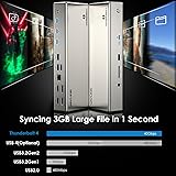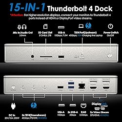 [15-in-1 Thunderbolt 4 Dock] Features a comprehensive range of ports, including 1x Upstream Thunderbolt 4 Port (40Gb/s, 98W), 1x 160W Power adapter, 3x Downstream Thunderbolt 4 Ports (40Gb/s; PD15W; 8K), 1x 2.5Gbps RJ45 Ethernet port, and 2x Video Stream (4K DP+ 4K HDMI),1x Audio, 1x SD Card Slot (312MB/s), 2x USB-A 10Gbps+2x USB-A 5Gbps. Connect all your essential peripherals with ease. NOTE: This dock is Thunderbolt 4 and Displaylink DL6950 hybrid solution,please download the latest driver from DisplayLink before using the HDMI/DP ports. [Single 8K Display & Multiple 4K Displays] This Thunderbolt 4 dock supports an impressive single 8K display or Quad 4K displays (2x HDMI/DP + 2x Thunderbolt 4), providing stunning visuals and enhancing productivity. You can effortlessly switch between extend and mirror modes to customize your workflow. *Please note: M1/M2/M3-based Macs can only have one video output from the three Thunderbolt 4 ports, but the HDMI and DP ports function normally; HDCP like Netflix, Disney+, Hulu, and other streaming services will not work through HDMI/DP ports of this docking station. [40Gbps Transfer Speed & 98W Charging] Enjoy lightning-fast data transfer speeds with Thunderbolt 4 at 40 Gbps. The upsteam Thunderbolt 4 port supports up to 98W power delivery, allowing for efficient charging of your laptop. Additionally, the three downstream Thunderbolt 4 ports also offer 15W power delivery to keep multiple devices charged simultaneously. These extensive connectivity and power capabilities greatly enhance efficiency in your work. [Equipped 2.5G Ethernet & SD V4.0 card reader] Whether you're streaming, gaming, or working on bandwidth-intensive tasks, the 2.5G wired connection ensures a seamless online experience with enhanced network capabilities. Enjoy lightning-fast and lag-free connectivity without any interruption. An integrated SD V4.0 card reader supports blazing-fast speeds of up to 312 MB/s, allowing for fast and efficient transfer of files from SD cards, saving you valuable time and ensuring smooth workflow. [System Compatibility & Package] This DisplayLink and Thunderbolt 4 hybrid docking station is compatible with Thunderbolt 4/USB 4-enabled PCs running Windows 10/11 and Thunderbolt 3/4-enabled Macs running Mac OS 11 or later. Just enjoy seamless connectivity and enhanced functionality on your PC or Mac with this docking station. In the box: 1x Thunderbolt 4 Quad Display Docking Station, 1x 31 inch Thunderbolt 4 Cable, 1x Cable Holder, 1x 160W Power Adapter, 1x Quick Start Guide, 1x Driver Download Card.