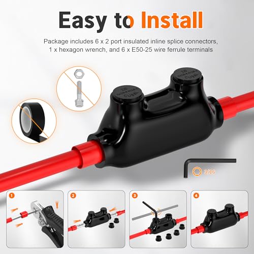 - Package Includes: Our package includes 6 x insulated inline splice connector 2/0-6 gauge wire connectors, 1 x hexagon wrench, and 6 x E50-25 wire ferrules terminals. It will come with all necessary accessories for convenient use. It can be used for a wide range of electrical applications, including cable trays, panel boards, solar wiring, ducts, raceways or troughs to ensure the normal operation of electrical systems