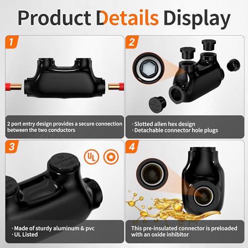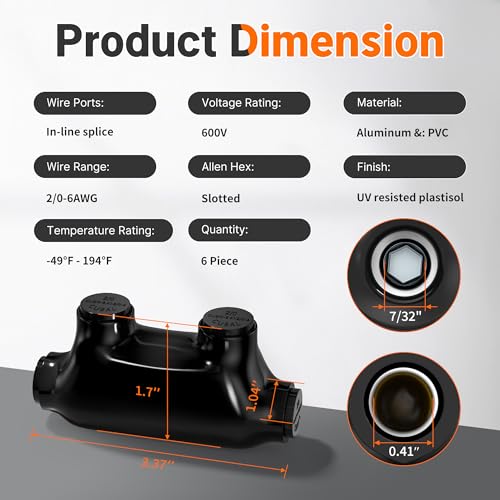 - Superior Material: Our inline splice connector 2/0-6 gauge is made of solid aluminum with rugged high dielectric rubber/PVC coating, these insulated multi tap connectors are UL Listed for reliability and safety. The aluminum wire connectors also come with pre-filled oxide inhibitor, which allows you to connect and disconnect wires quickly and efficiently