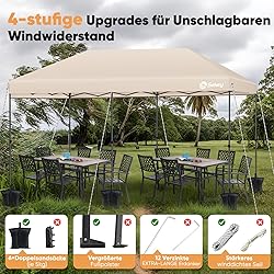 Easy to install in 1 minute: with the innovative one-touch screen, the 3 x 6 gazebo can be set up quickly and on its own. The height is infinitely adjustable from 270 cm to 200 cm. Maximum stability: Versatile and quality as well as a scratch-resistant spray paint guarantee maximum stability. With the enclosed safety bags, ground nails and sun rails, the gazebo remains secure even in strong winds. Waterproof and durable: the 420D Oxford fabric with UPF 50+ and safety protection reliably protects against rain and UV rays - ideal for all weather conditions. Durable and robust: thanks to the reinforced construction and high-quality materials, the gazebo can withstand strong winds and remains stable for years. Size 17 m² protection: with an area of 3 x 6 m and space for 12 to 10 minutes, the gazebo is perfect for families, parties or outdoor activities. The compact transport size fits in any boot. Complete and easy to use: the box contents include everything you need: frame, canopy, carry bag, ropes, nails, sandbags and manual (English language not guaranteed). Our professional service team is always available if you have any questions.