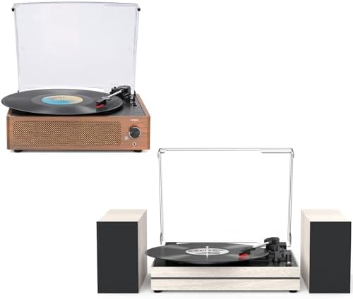 Record Player with Built-in Two Speakers Brown and Record Player with Two External Speakers White