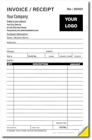 Listing is for a set of 50 forms (2 Part - White/Yellow) sales invoice form custom printed with your company informtion and starting number. Black & White prints. Duplicate carbonless forms come in a size of half sheet (8.5" X 5.5"). Option to include your logo.