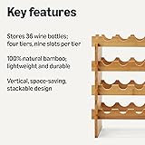 36-BOTTLE STORAGE: 4-tier rack holds 9 standard-size 3-3.2-inch wine bottles per level (36 total) NATURAL BAMBOO CONSTRUCTION: 100% natural bamboo wine rack offers lightweight durability and a clean, minimal aesthetic STACKABLE DESIGN: Modular design allows stacking multiple units to expand storage capacity while maintaining stability FREESTANDING DESIGN: Vertical wine bottle holder is suitable for countertops, bar carts, and more EASY ASSEMBLY: Dimensions: 33.5 x 9.8 x 21.65 inches (WxDxH); hassle-free, no-tool assembly