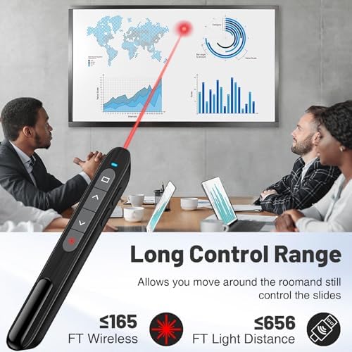 - 【LONG RANGE WIRELESS PRESENTATION CLICKER】The red light pointer for presentations can easily highlight key areas of the slides. The red light projection distance is up to 656 feet, the 2.4G wireless range is up to 165 feet, and the 360°flexible control allows you to freely and flexibly interact with the audience outside the screen