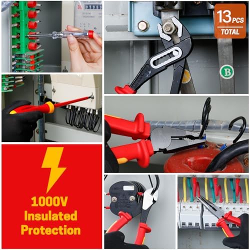 - Comprehensive Insulated Tool Set: The set includes 7 insulated screwdrivers (4 flathead, 3 Phillips), insulated pliers (linesman pliers, long nose pliers, diagonal cutters, and water pump pliers), and a voltage tester. These insulated tools are suitable for a variety of electrical tasks, helping you complete your work safely and efficiently.