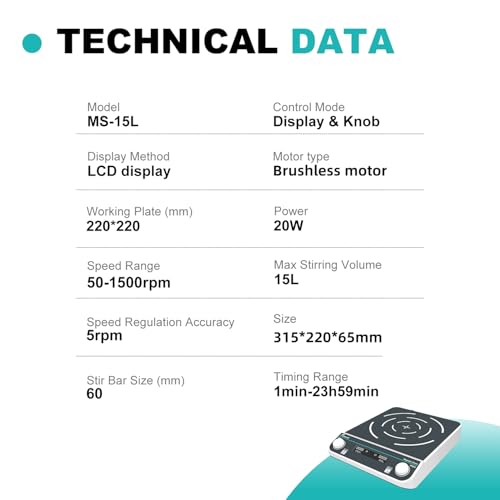 - [PRODUCT DETAILS】Model:MS-15L;Working plate size:8.7"X8.7"(220mm*220mm);Speed:50-1500RPM;Timing:1min-19h59min;Control:knob control;Voltage:AC100-240V