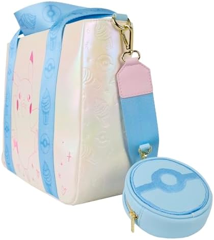 The iridescent Pokémon bag of your dreams! This tote bag features Pikachu embroidered front and center. All around and on the straps, you'll find designs of hearts, Poké Balls, and sweet treats. Attached to the crossbody strap is a coin bag that looks like a Poké Ball. Pack everything you need for training and look seriously cute!