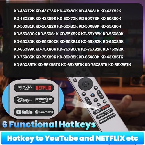 - [Wide Compatibility] Replacement for sony rmf-tx910u remote control is compatible with a wide range of sony smart tvs, including models such as 4K Ultra HD LED Series--KD55/43/50/65/75/85X77L; For BRAVIA XR Series: QD-OLED A95L Series--XR65/55/77A95L; Mini LED X95L X93L Series--XR85X95L, XR65/75/85X93L; OLED A80L Series--XR65/55/77/83A80L; Full Array LED X90L Series--XR55/65/75/85/98X90L; OLED A75L Series--XR55A75