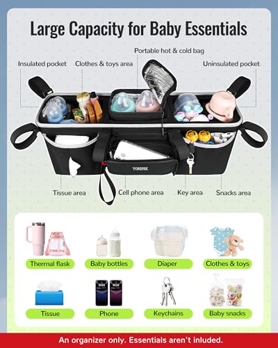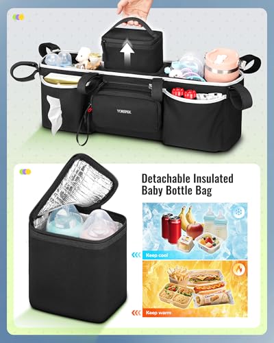 - 8 Handy Compartments: YOREPEK baby caddy organizer for twin stroller keeps all your baby stroller essentials neatly organized and within easy reach; 2 extra-large side pockets securely hold bottles or even a compact umbrella, while the roomy middle compartment fits snacks, toys, diapers, wipes and other baby accessories; For quick access, 2 front pockets store tissues, pacifiers or hand sanitizer, and a detachable phone bag keeps your device accessible