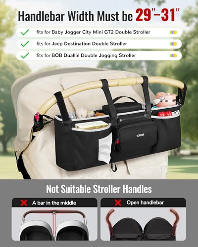 YOREPEK Heavy Duty Double Stroller Organizer for Bob Duallie, Baby Jogger City Mini GT2 and Jeep,Stroller Caddy with Detachable Cooler Bag and Handbag,Stroller Storage Attachment for Baby Accessories