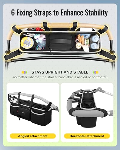 - 6 Fixing Straps Stability: YOREPEK double stroller organizer bag features 6 adjustable hook-and-loop straps that flexibly fasten to stroller parent console handlebars at various angles—whether horizontal or inclined; This thoughtful design ensures the double jogging stroller organizer stays level and stable during use, preventing tilting and keeping your baby's items securely in place
