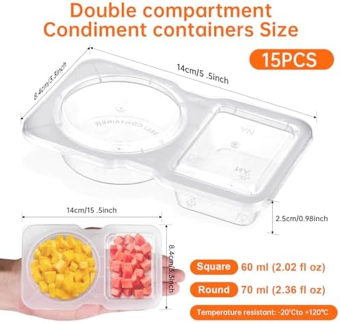 15 Sets Double Compartment Condiment Containers with Lid, Transparent Small Plastic Dipping Containers for Condiments or Dips, Sauce Snack, Salad Dressing, Sampling, Travel Snack