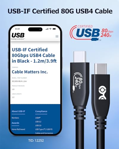 - USB-IF Verified for Reliable Performance: The Cable Matters USB4 to USB4 cable is USB-IF Verified, meeting the highest USB4 standards for superior performance. Supporting up to 80Gbps bandwidth, 8K video at 120Hz, and 240W charging, this USB Type-C cable ensures flawless high-speed data transfer and USB PD 3.1 Extended Power Range (EPR) for reliable power delivery. Also compatible with Thunderbolt 5, providing up to 80Gbps bandwidth for cutting-edge performance.