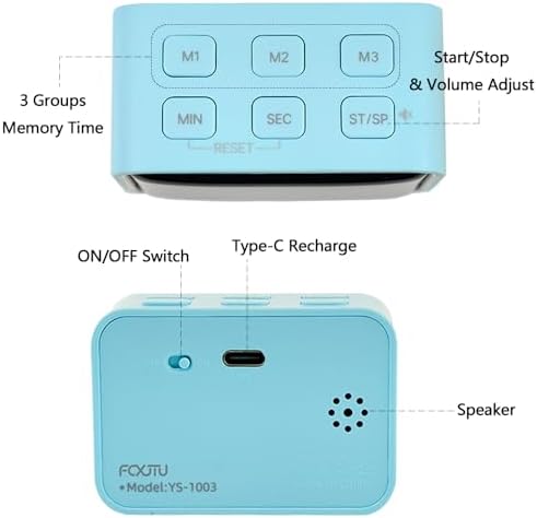 FCXJTU ULTRA CLEAR MINI LED DISPLAY RECHARGEABLE DIGITAL COUNTDOWN TIMER 2.6 inch digital white LED display with 1.5 inch tall big clear numbers allows it easy to see the time remaining. Main Feature Count up: up to 99 minutes and 59 seconds. Countdown: up to 99 minutes and 59 seconds. Three Pre-Set Memory Time: M1--5Min, M2--15MIN, M3--25MIN; Memory time can be adjusted to meet different timing needs Eco-Mode Brightness Display: Non-working state: Automatic screen standby after 10Sec; In working state: Automatic brightness reduction after 10Sec. Sound Alarm or Mute Screen Flash; Built-in Rechargeable Lithium Battery ON/OFF Function : FCXJTU Mini LED Display Digital Timer Why bring a boring timer into your home decor when you can buy a timer with such sleek design, easy to read display with clear LED numbers. All the features are based on the real voice of our customers in the past years. It could meets almost all your needs no matter you’re a housewife, a chef, a mom, a teacher, a student or anyone may need a timer. Countdown: 99 Minutes 59 Seconds to 00:00. Count Up: 00:00 to 99 Minutes 59 Seconds. · Memory Function Kitchen Timer: The mini led kitchen timer has three Pre-set memory time: M1--5Min, M2--15MIN, M3--25MIN; All the 3 memory time can be adjusted to meet different timing needs Setting of Memory Time In the reset state or timing stop state, press M1/M2/M3 to select one of the times to set. If M1 setting is selected, keep pressing the M1 button for about 2 seconds until the value flashes. At this time, press MIN and SEC button to set minutes or seconds respectively (keep pressing to quickly increase the value, and press MIN+SEC buttons at the same time to reset). After setting, press M1 button to exit the setting and save the memory time. Using Memory Time: In the reset state or timing stop state, press M1/M2/M3 to select a memory time to use, and press ST/SP button to start timing. It is easy to start quick countdown no need to set time every time. Rechargeable digital timer with LED display Kitchen timer not rechargeable, need to change batteries often? We have designed the fashion rechargeable digital kitchen timer with a clear LED display and ON/OFF function.This led timer is powered by a 500mAh lithium battery, which can be used for about 20 hours when fully charged. When the battery is too low, the screen will display the low battery icon . The icon flashes during the charging. When the charging icon stops flashing, it means that the charging is complete and the charging cable can be unplugged. How to use countdown timer In the reset state or the timer stop state, press the MIN and SEC buttons to set the minute and second respectively (keep pressing to quickly increase the value). After setting, press the ST/SP button to start the timing. During the timing, press ST/SP to stop or continue the countdown. When the countdown time is up, a reminder of 30 seconds will be displayed. Press any button to stop the reminder and reset to the initial time.