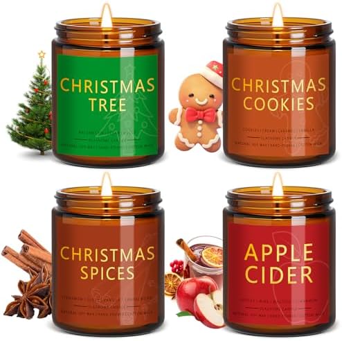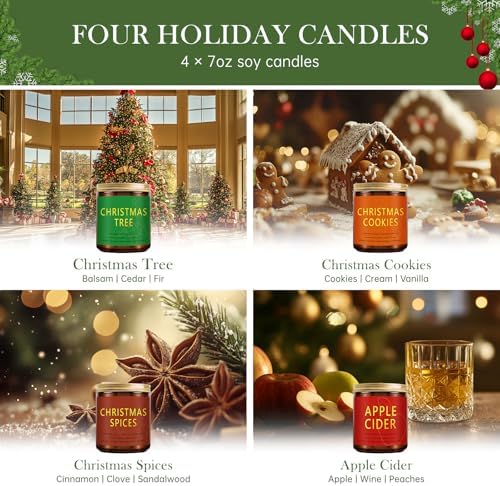 Christmas Candle Gift Set, 4 Pack 7 oz Soy Scented Candles for Home, Holiday & Birthday Gift for Women & Men, Includes Christmas Tree, Cookies, Spices & Apple Cider, Winter Holiday Home Decor