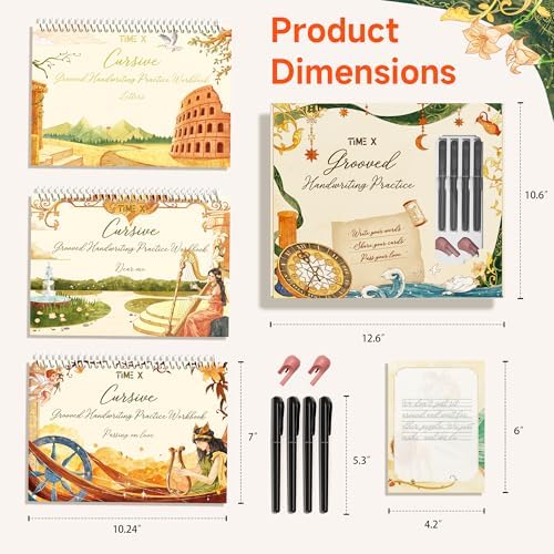 TIME X Grooved Cursive Handwriting Workbook Kit - Cursive Handwriting Workbook for Kids 8-12 and Adults - 3Pcs Magic Reusable Handwriting Workbook with Detachable Quote Postcards - 12.6"x10.6"