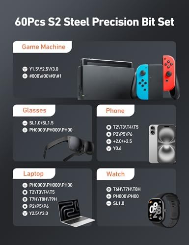- 60-Piece S2 Precision Bit Set: The AstroAI Electric Screwdriver comes with 60 S2 steel precision bits and special JIS drill bits for Japanese electronic devices, effectively preventing screws from loosening. This set includes general-purpose drill bits and specific bits for iPhones. These bits, along with the magnetizer, pry bar, and precision tweezer, form a 63-in-1 multifunctional tool, making it perfect for assembling and disassembling a variety of electronics.
