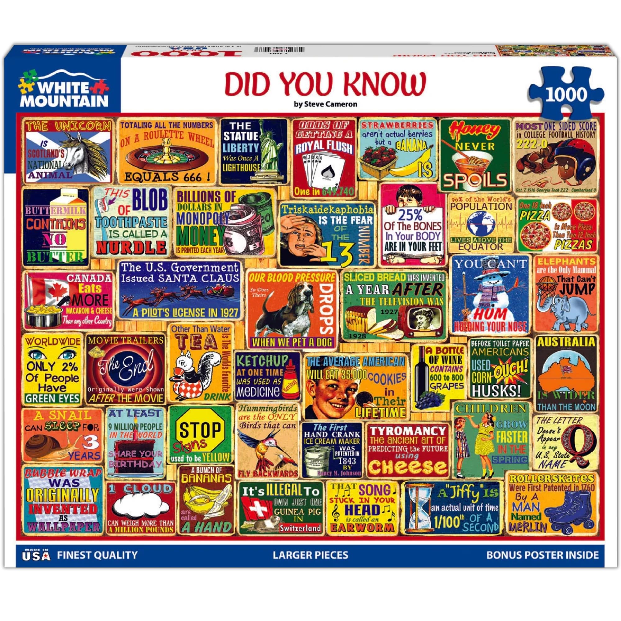 - Quality: White Mountain is known for our precision cutting technique so each piece fits just right. Our puzzles measure 24” x 30” when finished. Visit our store page to see a wide variety of puzzles.