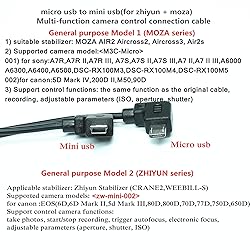 - Micro to Mini usbcamera control cable Universal multi-function cable A-----for zhiyun micro usb -mini usb Name of the original wire(ZW-Mini-002) 1) Applicable stabilizer: ZY Stabilizer (CRANE2,WEEBILL-S)2) Camera brand model that supports control: for canon :EOS(6D,6D Mark II,5d Mark III,80D,800D,70D,77D,750D,650D)3) Support control camera functions: take photos, start/stop recording, trigger autofocus, electronic focus, adjustable parameters (aperture, shutter, ISO) 4) After connecting the cable, you need to set the camera manufacturer on the stabilizer before use. Press the large disc on the stabilizer under the "MENU" - Camera-canon, then turn off the camera power and turn it back on, you can control the function5)(crane2,weebill-s) Please refer to the video demonstration on the main image.for Canon Settings Note1. Due to the camera system, if you need to take pictures, please switch the camera shooting mode to take pictures; If you want to record, switch the camera mode to video. 2. Due to differences in lens control logic, when using electronically controlled focus, the lens needs to select AF (autofocus) gear, and the body needs to turn off the AF Servo function.B-----for MOZA micro usb -mini usb Name of the original wire(M3C-Micro) 1) suitable stabilizer: MOZA( AIR2, Aircross2, Aircross3, Air 2s ) 2) Supported camera model: 001) for sony:A7R,A7R II,A7R III, A7S,A7S II,A7S III,A7 II,A7 II III,A6000,A6300,A6400,A6500,DSC-RX100M3,DSC-RX100M4,DSC-RX100M5 002)for canon:5D Mark IV,200D II,M50,90D