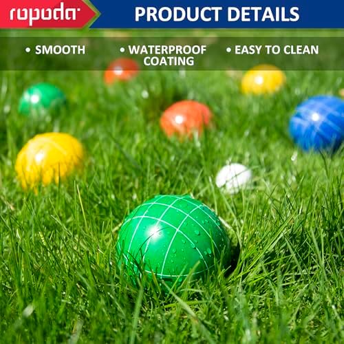 - MORE PROFESSIONAL AND FUN: ropoda 107mm bocce ball set includes 8 resin bocce balls with two distinct patterns and 4 colors(yellow, blue, green, red), one 60mm pallino (target ball), and a handy measuring stick for accurate scoring. Bright, high-quality resin bocce balls make backyard/beach/lawn activities more fun, and the more professional size and weight make the game more challenging and exciting
