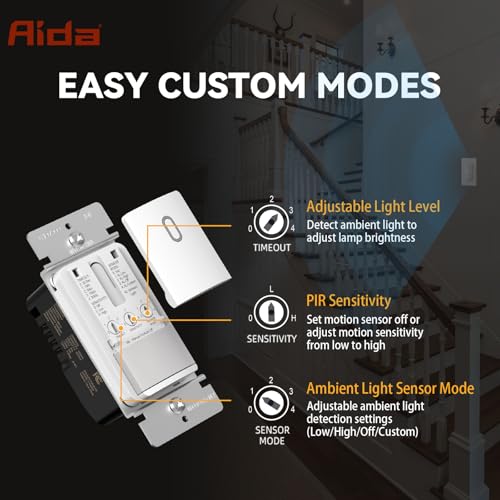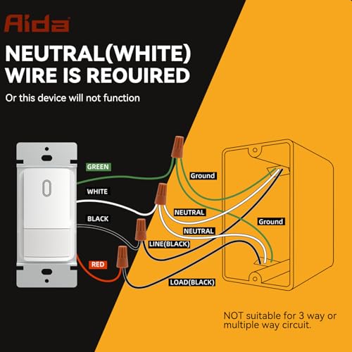 AIDA Single Pole Motion Sensor Light Switch w/Neutral Wire - 120° PIR Infrared Activation - CFL/LED/MLV/INC/HAL/Fan Compatible - UL Certified - 1 Pack,Matte White