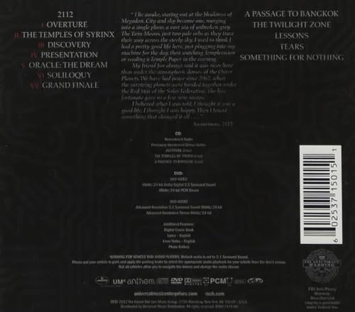 CD + DVD deluxe edition. 2112 is the fourth studio album by Canadian rock band Rush. The deluxe edition of Rush's 2112 re-release includes three bonus tracks and a DVD with a 5.1 surround sound audio mix and an interactive digital comic book, a new album cover by original album designer Hugh Syme, liner notes, and unpublished photos. Track List: Disc 1 – CD 1. 2112 2. A Passage To Bangkok 3. The Twilight Zone 4. Lessons 5. Tears 6. Something For Nothing 7. Overture (Bonus Live Track) 8. The Temples Of Syrinx (Bonus Live Track) 9. A Passage To Bangkok (Bonus Live Track) Disc 2 – DVD
