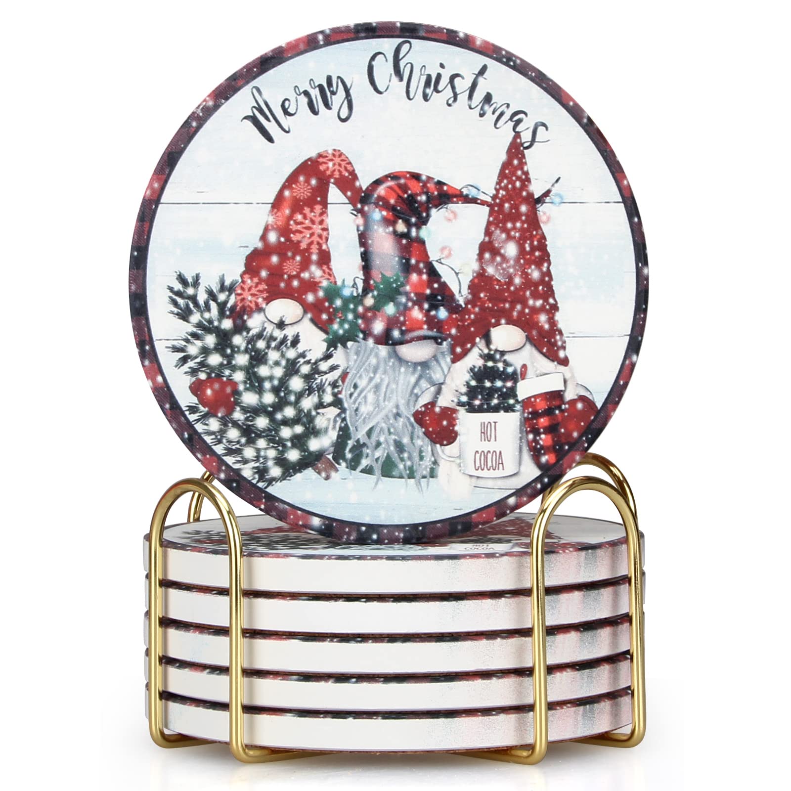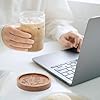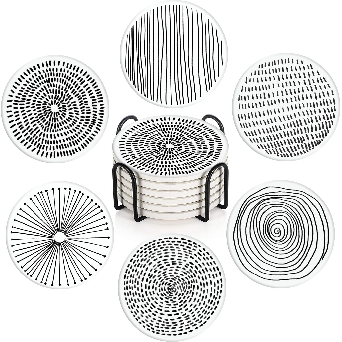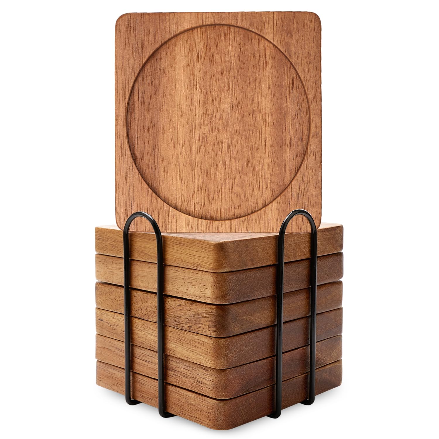- ACACIA WOOD COASTERS With HOLDER: 6 pcs 4" round wooden coasters and a black metal coaster holder. Perfect size accommodates most mugs and drinking containers.Great as coffee table decor, dining table accessories, coffee table centerpiece.