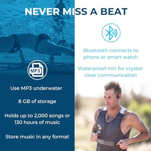- REVOLUTIONARY DUAL-MODE PERFORMANCE: Our most advanced bone conduction technology delivers vibrant, crystal-clear audio when switching between environments. Use Bluetooth 5.3 for streaming music, podcasts, or taking calls during any land activities. For underwater adventures, switch to MP3 mode to enjoy uninterrupted playback from the built-in 8GB memory, providing clear audio up to 12 feet underwater