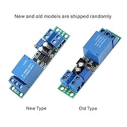 - Specification: Operating Voltage: DC 12V Load Capacity: AC 250V 10A; DC 30V 10A Delay Time: T(S)=1.1*R(Ω)*C(f); e.g.if capacitor is 47uf, resistor is 500KΩ, T=1.1*0.000047*500000=25.85sec. Size:Approx. 67 x 16mm/2.64 x 0.62 Working Principle: 1. Power on the module (12V or 5V) and relayis energized immediately. N.O. terminal is connected to COM terminal. 2. Relay is dis-energized after 0 to 25seconds. N.C. terminal is connected to COM terminal. 3. Relay keeps dis-energized until there isan external trigger 4. If there is always trigger signal, relaywill keep energized until trigger disappears, then dis-energized after 0to 25 seconds. Now N.C. terminal is connected to COM terminal. Package Includes: 5 x Timer Relay Module Note: Please note that the new type and old type of this product will be sent randomly, and make sure you will not mind before ordering.