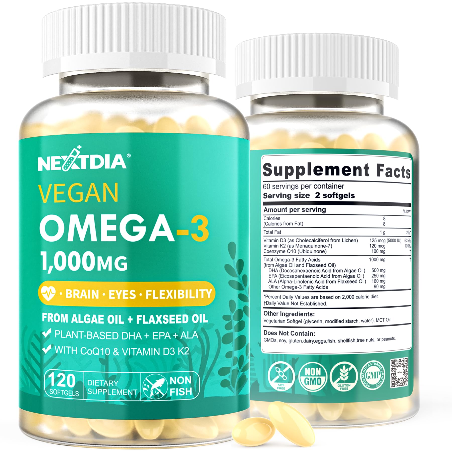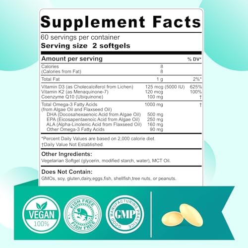 Vegan Omega 3 DHA EPA ALA Supplement with 5000IU Vitamin D3 K2 (MK7), CoQ10 for Women Men | Fish Oil Alternative | Plant Based Algae Oil Omega 3 1000mg Pills for Bone, Brain, Eye, Skin | 120 Softgels
