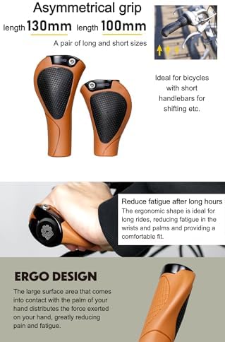 ・[Product contents] Bicycle grip [Size] 130x100mm [Weight] Approx. 180g/pair [Material] PP, TPR [Specifications] Ergonomic shape, wide wing [Suitable fit handlebar diameter] 20-22.2mm [Color] Brown・●Long and short combination grip ●Minimizes hand fatigue and strain for comfort even for long periods of time ●Ergonomic shape based on ergonomics ●Places the palm flat to disperse force and alleviate fatigue ●Deepness that feels comfortable even when you change the grip position・● Comfortable grip and excellent fit ● Finely textured grip pattern increases grip strength ● TPR material with excellent durability, abrasion resistance, slip resistance, and impact resistance ● For replacing grips on flat handlebars such as cross bikes and MTB ● Enjoy customizing your bicycle as grips can be easily replaced・[Combination of different lengths] The left and right lengths are different, making it ideal for those with different handle exposures. It is a combination of long 130mm and short 100mm.・[Ergo Grip] The ergo shape is suitable for long-term riding, and can be expected to reduce wrist and palm fatigue and provide a good fit. The large area that comes in contact with the palm disperses the force applied to the hand, significantly reducing pain and fatigue. Design based on ergonomics.・[Lock-on type] The grip uses a "lock-on type" that is easy to install, allowing for smooth grip replacement using tools. It can be used with confidence by everyone from beginners to advanced users.・[Anti-slip] The finely textured grip pattern increases grip strength. Non-slip even when wet with sweat or rain.・[Compatible with various bicycles] Handlebar diameter: 22.2mm. Suitable for most types of bicycles. *Please note that some handles with special handle diameters cannot be used.・[TPR material] Durable and has excellent wear resistance, slip resistance, and impact resistance. A grip that feels like it sticks to your hand.
