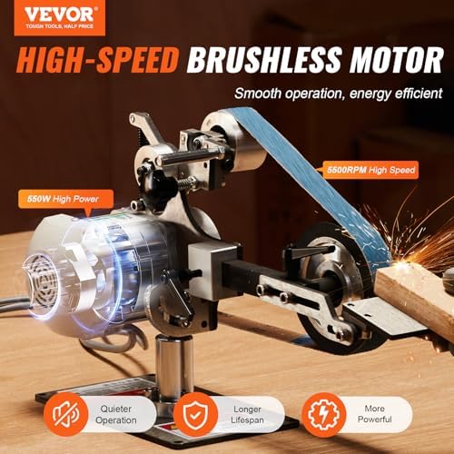 - Powerful Performance: Equipped with a 550W pure copper motor running at 5500 rpm, the VEVOR belt grinder sander delivers superior grinding power, quieter operation, and enhanced durability compared to ordinary motors. Enjoy smooth running and stable tracking without worrying about overheating.