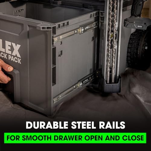 Roll everything you need to and from the jobsite with the FLEX STACK PACK™ 1-Drawer Rolling Tool Box. Its removable telescoping handle allows for easy transport in a covered truck bed, and you can tackle any terrain with its rugged 9-inch rubber wheels. This single-drawer toolbox features auto-locking mechanisms that securely close and prevent the drawer from opening during transport while durable stainless steel rails ensure the drawer opens and closes smoothly over a long life. The drawer offers a 70-pound weight capacity while the box can support up to 250 pounds of weight stacked onto it. Quick-connect latches offer fast and effortless connectivity so you can quickly stack and unstack toolboxes for a fully customized STACK PACK™ configuration to roll with you from job to job. It’s protected by a one-year limited warranty when registered within 30 days of purchase at registermyflex.com.