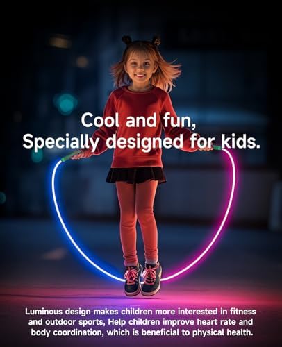 • Rechargeable & Smooth Rotation: This light-up jump rope comes with a charging cable. Once fully charged, it lasts up to 180 days on a single charge, eliminating the need for battery replacements. Beyond the cool light show, the rope spins smoothly, enabling fun and effective workouts.